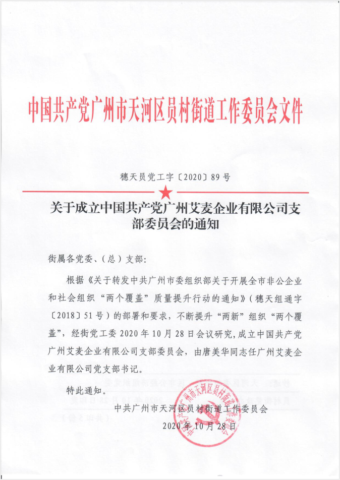 在2020年秋高氣爽的豐收季節里,中國共產黨廣州艾麥企業有限公司支部委員會經天河區員村街道黨工委批準,于10月28日正式成立,唐美華同志任廣州艾麥企業有限公司黨支部書記。